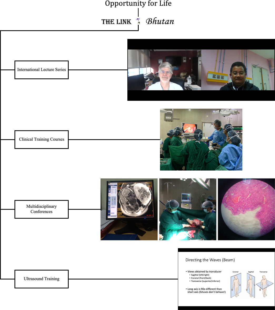 Realizing that ultrasound imaging has become integral to the practice of obstetrics and gynecology and with the advent of international guidelines, the fourth program of The Link project, Ultrasound Training, has been developed. The ultrasound training course in obstetrics and gynecology will be restructured for remote interactive hands-on teaching by well-recognized specialists. The course will be customized for the university to coordinate with the ultrasound teaching and practices already in place. After the structured concentrated segment of the course, training will continue with ongoing engagement of the specialists with case review and consultation.